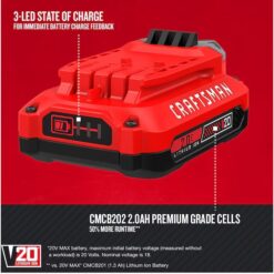 The V20* Lithium Ion Battery provides up to 3x the capacity versus the standard of a standard 20V MAX* lithium battery*. They are compatible with the CRAFTSMAN® V20* cordless power tool and outdoor tool lineup. The professional grade high performance cells provide improved power and a longer cycle life. Each pack is equipped with a 3-LED state of charge for immediate battery charge feedback. No memory and virtually no self-discharge means this battery is ready when you are.