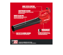 CRAFTSMAN CMCBL700D1 V20 Cordless Axial Blower is perfect for quick clean ups on walkways and driveways and provides up to 340 CFM and 90 MPH.