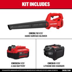 CRAFTSMAN® V20* Cordless Hard Surface Blower Kit features a reliable motor with up to 200 CFM and up to 90 MPH. It is equipped with a 4.0 Ah battery allowing you to take on various tasks outdoors. The V20* battery platform is compatible with CRAFTSMAN V20* Outdoor Equipment and Power Tools. You’ll find the complete line of outdoor tools and equipment essentials for a job to make you proud.