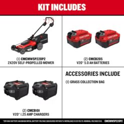 Get long runtime with the CRAFTSMAN® self-propelled 2x20V cordless mower. This battery-powered mower features a powerful brushless motor and is equipped with two 5.0 Ah batteries, allowing the mower to perform up to 50 minutes of runtime. The low-profile design provides easy access to hard-to-reach areas and takes up 78% less space with vertical space savings (vs in operation). The V20* battery platform is compatible with CRAFTSMAN® V20* outdoor equipment and power tools. You’ll find the complete line of outdoor tools and equipment essentials for a job to make you proud.