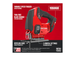 CRAFTSMAN CMCS600B V20 Cordless Variable Speed Jig Saw (Tool Only) delivers precision in a wide range of applications.