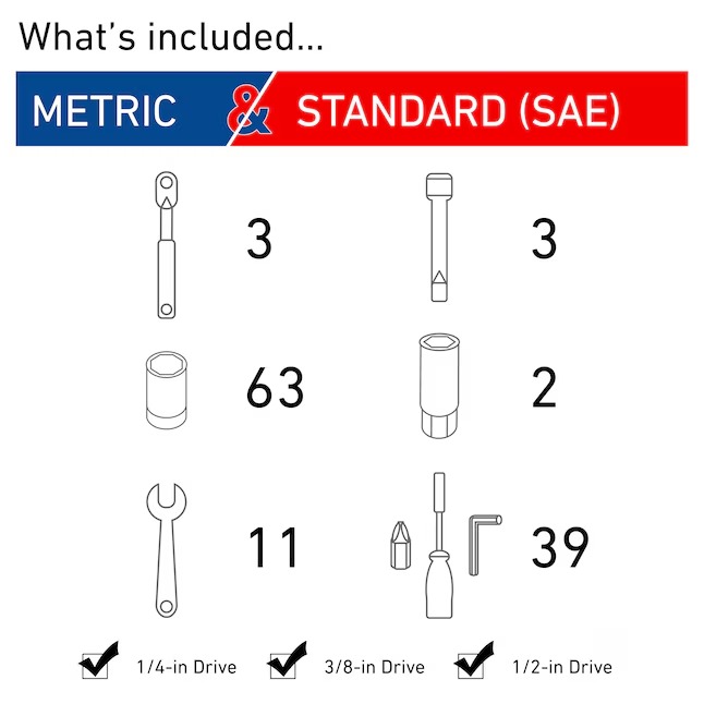 | 3/8-in Drive Ratchet Included | Yes | Number of Sockets | 63 |