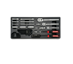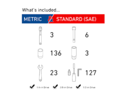 - Also includes (3) Universal Joints (1/4,3/8,1/2-in Dr), (1) 1/4-in Dr Bit Driver, (1) 3/8-in Dr Size Adapter (1/4-in), (1) 1/2-in Dr Size Adapter (3/8-in), (3) Ratchets (1/4,3/8,1/2-in Dr), (28) Long Arm and (16) Short Arm Hex Keys and (33) Specialty Bits