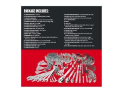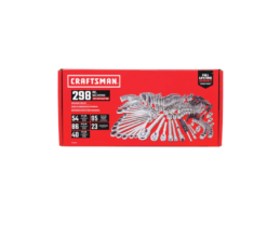 The CRAFTSMAN CMMT12039 298 pc Master Mechanics Tool Set comes equipped with 72 Tooth ratchets and a broad assortment of drive tools. This set is perfect for automotive repair, general construction, and DIY repairs. 298 pc set includes: (11) SAE and (13) MM 1/4-in Dr Shallow 6 PT Sockets (SAE: 5/32,3/16,7/32,1/4,9/32,5/16,11/32,3/8,7/16,1/2,9/16-in; MM: 4,4.5,5,5.5,6,7,8,9,10,11,12,13,14mm), (10) SAE and (13) MM 1/4-in Dr Deep 6 PT Sockets (SAE: 5/32,3/16,1/4,9/32,5/16,11/32,3/8,7/16,1/2,9/16-in; MM: 4,4.5,5,5.5,6,7,8,9,10,11,12,13,14mm), (13) SAE and (17) MM 3/8-in Dr Shallow 6 PT Sockets (SAE: 1/4,5/16,3/8,7/16,1/2,9/16,5/8,11/16,3/4,13/16,7/8,15/16,1-in; MM: 6,7,8,9,10,11,12,13,14,15,16,17,18,19,20,21,22mm), (11) SAE and (15) MM 3/8-in Dr Deep 6 PT Sockets (SAE: 1/4,5/16,3/8,7/16,1/2,9/16,5/8,11/16,3/4,13/16,7/8-in; MM: 6,7,8,9,10,11,12,13,14,15,16,17,18,19,21mm), (11) SAE and (10) MM 1/2-in Dr Shallow 12 PT Sockets (SAE: 3/8,7/16,1/2,9/16,5/8,11/16,3/4,13/16,7/8,15/16,1-in; MM: 13,14,15,16,17,18,19,21,22,24mm), (6) SAE and (6) MM 1/2-in Dr Deep 12 PT Sockets (SAE: 3/8,7/16,1/2,9/16,5/8,3/4-in; MM: 14,15,16,17,18,19mm), (9) SAE and (7) MM Nut Bits (SAE: 5/32,3/16,7/32,1/4,9/32,5/16,11/32,3/8,7/16-in; MM: 5,6,7,8,9,10,11mm), (12) SAE and (12) MM Combination Wrenches (SAE: 1/4,5/16,11/32,3/8,7/16,1/2,9/16,5/8,11/16,3/4,13/16,7/8-in; MM: 8,9,10,11,12,13,14,15,16,17,18,19mm), (6) SAE and (8) MM 3/8-in Dr Hex Bit Sockets (SAE: 5/32,3/16,1/4,5/16,7/32,3/8-in; MM: 4,5,6,7,8,10,14,17mm), (3) 1/4-in Dr Torx Bit Sockets (T15,T20,T25), (4) 3/8-in Dr Torx Bit Sockets (T30,T40,T45,T50), (3) 3/8-in Dr Slotted Bit Sockets (7/32,9/32,3/8-in), (3) 3/8-in Dr Phillips Drive Bit Sockets (PD1,PD2,PD3), (3) 3/8-in Dr Spark Plug Sockets (5/8,3/4,13/16-in), (2) 1/4-in Dr Ext Bars (3,6-in, (2) 3/8-in Dr Ext Bars (3,6-in) and (2) 1/2-in Dr Ext Bars (3,6-in). See bullet point below for additional tools included. CRAFTSMAN CMMT12039