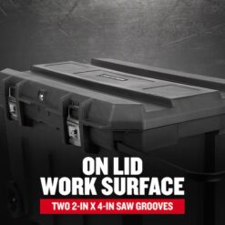 - On lid work surface: Wide work surface on lid that includes two 2-in x 4-in saw grooves