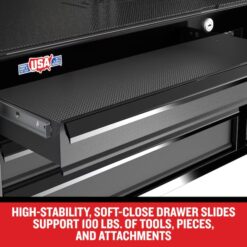 - High-stability, soft-close drawer slides support 100-lbs of tools, pieces, and attachments