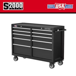 Securely organize up to 100-lbs of attachments and tools with this fortified S2000 52-in 10-Drawer Rolling Tool Cabinet. The drawers were made to close gently by themselves so they don’t slam and cause damage over time. With a 1,500-lb load rating, toe-locking brakes, and strong mounting casters, safely stow a wide variety of light and heavy tools to easily access them without breaking your work rhythm.