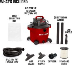 CRAFTSMAN CMXEVBE18695 16 Gallon 6.5 Peak HP Wet/Dry Vac, Heavy-Duty Shop Vacuum with Muffler/Diffuser and Attachments, Red