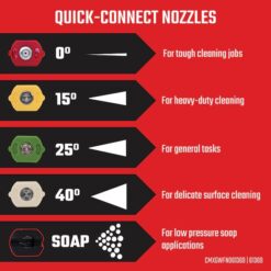 - 4 Quick connect nozzle tips: 0°,15°, 40°, and soap to use for a variety of cleaning applications