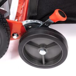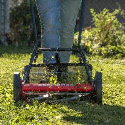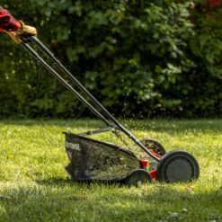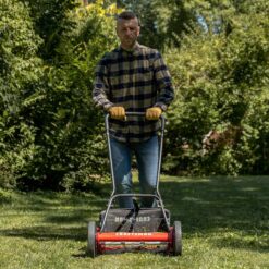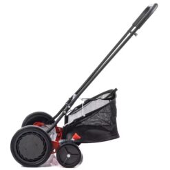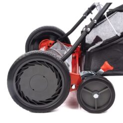 - Lightweight manual push mower with comfortable padded cushioned grip and rear wheels for greater comfort and maneuverability.