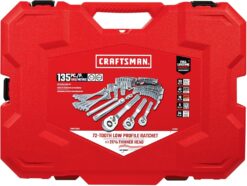 The 135 pc. 1/4-in., 3/8-in., and 1/2-in. Drive Mechanics Tool Set is equipped with improved low profile 72-tooth ratchets with 5° arc swing and up to a 25% thinner head* that helps deliver greater access in confined spaces. Packed with a broad assortment of 6-point and 12-point sockets, combination wrenches, and drive tools in a durable blow mold case. The case is constructed with metal hinges and designed to fit into CRAFTSMAN metal storage boxes for easy organization. Perfect as an addition to your current tool collection or as a starter set. Proudly backed by a Full Lifetime Warranty. *1/4” DR and 3/8” DR Only As Compared To CMMT81747, CMMT81748, & CMMT81749