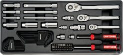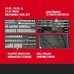 This all-in-one 298 pc. Mechanics Tool Set comes equipped with 1/4-in., 3/8-in., and 1/2-in. drive improved low profile 72-Tooth ratchets with a 5° arc swing and up to a 25% thinner head* that helps deliver greater access in confined spaces. Packed with a comprehensive assortment of 6-point and 12-point sockets, ratcheting wrenches, and drive tool accessories, this set is perfect for automotive and DIY repairs or as a complete starter set. Tools come assembled in plastic trays for easy organization. Proudly backed by a Full Lifetime Warranty. *1/4” DR and 3/8” DR Only As Compared To CMMT81747, CMMT81748, & CMMT81749