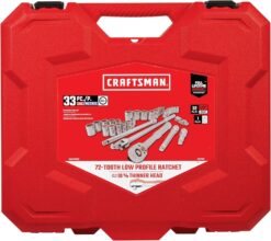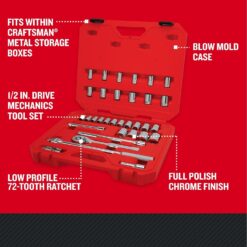 The 33 pc. 1/2-in. Drive Mechanics Tool Set comes equipped with a low profile 1/2-in. 72-tooth ratchet with a 5° arc swing and up to a 10% thinner head* that helps deliver greater access in confined spaces. Includes an assortment of 12-point sockets and drive tools packed in a durable blow mold case. The case is constructed with metal hinges and designed to fit into CRAFTSMAN metal storage boxes for easy organization. Proudly backed by a Full Lifetime Warranty. *As Compared To CMMT81749