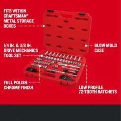 The 83 pc. 1/4-in. and 3/8-in. Drive Mechanics Tool Set is equipped with improved low-profile 1/4-in. and 3/8-in. drive 72-tooth ratchets with 5° arc swing and up to a 25% thinner head* that helps deliver greater access in confined spaces. Packed with a broad assortment of 6-point sockets and drive tools in a durable blow mold case. The case is constructed with metal hinges and designed to fit into CRAFTSMAN metal storage boxes for easy organization. Perfect as an addition to your current tool collection or as a starter set. Proudly backed by a Full Lifetime Warranty. *As Compared To CMMT81747, CMMT81748