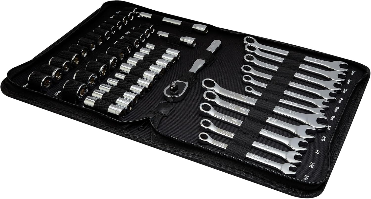 Perfect for automotive and DIY repairs, the 47 pc. Mobile Mechanics Tool Set comes equipped with a low profile 3/8-in. drive 72-tooth ratchet with a 5° arc swing and up to a 25% thinner head* that helps deliver greater access in confined spaces. Packed in a soft zipper case along with a broad assortment of 6-point sockets, combination wrenches, and drive tool accessories, this is the perfect on-the-go Mechanics Tool Set. Proudly backed by a Full Lifetime Warranty. *As Compared To CMMT81748
