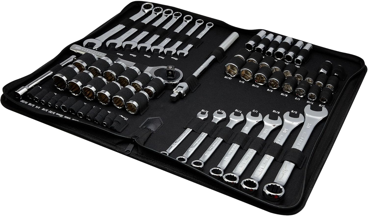 Perfect for automotive and DIY repairs, the 47 pc. Mobile Mechanics Tool Set comes equipped with a low profile 3/8-in. drive 72-tooth ratchet with arc swing and up to a 25% thinner head* that helps deliver greater access in confined spaces. Packed in a soft zipper case along with a broad assortment of 1/4-in., 3/8-in., and 1/2-in. 6-point and 12-point sockets, combination wrenches, and drive tool accessories, this is the perfect on-the-go Mechanics Tool Set. Proudly backed by a Full Lifetime Warranty. *As Compared To CMMT81748