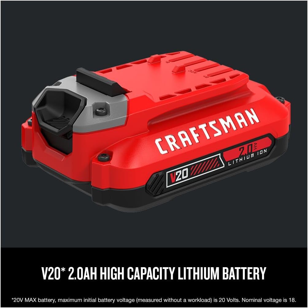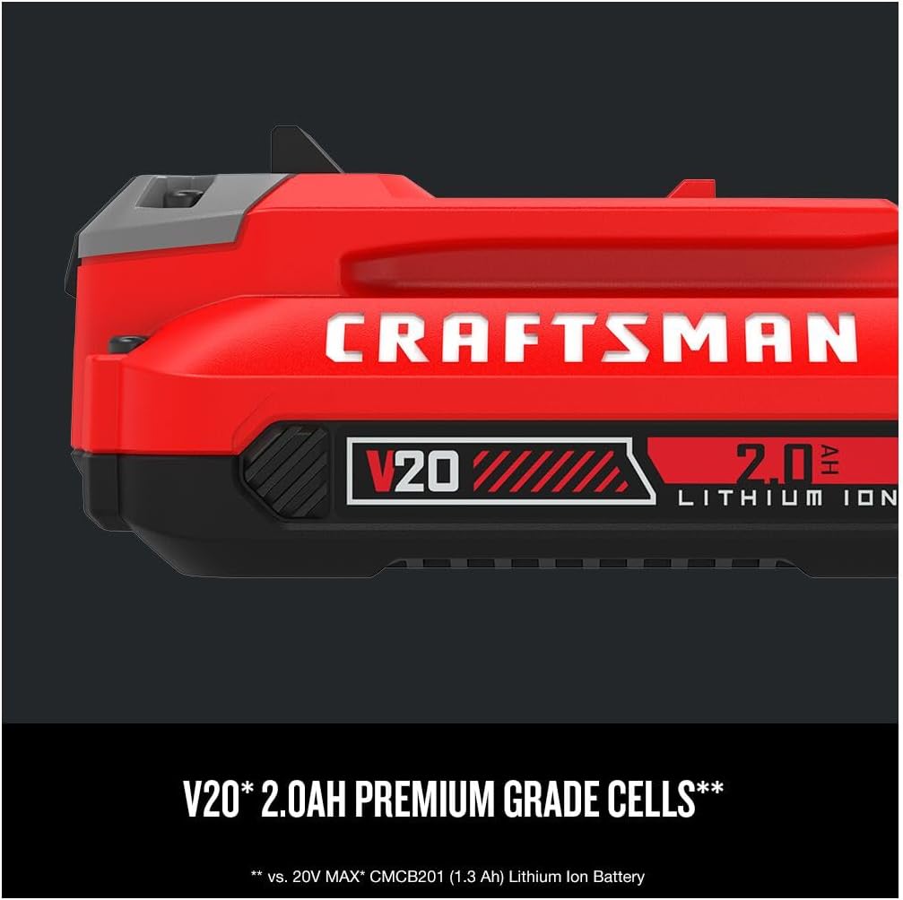 This 2 pack of V20* 2.0Ah Lithium Ion Batteries provides up to 1.5x the runtime of a standard 20V MAX* lithium battery**. They are compatible with all the CRAFTSMAN V20* cordless power tool and outdoor tool lineup. The professional grade high performance cells of CRAFTSMAN 20V battery provide improved power and a longer cycle life. Each pack is equipped with a 3-LED state of charge for immediate battery charge feedback. No memory and virtually no self-discharge means these batteries are ready when you are.