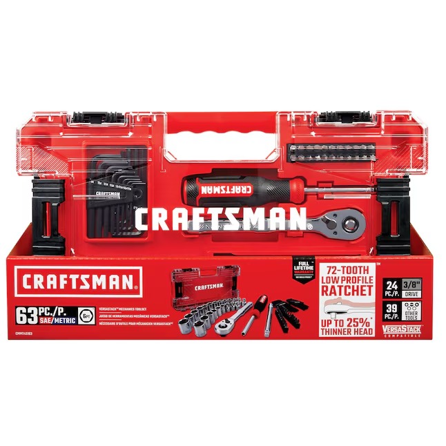 The 63 pc. VERSASTACK™ Mechanics Tool Set is ideal for enhancing an existing tool arsenal or makes a great starter set. It features a low profile 3/8-in. drive 72-tooth ratchet with a 5° arc swing and a set of 3/8-in. drive sockets and drives tool accessories. Improved low profile head design has up to a 25% thinner head, as compared to CMMT81748, to allow greater access to confined spaces. Integrates seamlessly into the CRAFTSMAN® VERSASTACK™ storage platform with the compatible storage case. All tools meet or exceed ASME specifications and are backed by a Full Lifetime Warranty. Take on your next project with the CRAFTSMAN® 63 PC. VERSASTACK™ Mechanics Tool Set.