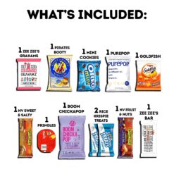 - DIMENSIONS: 12.2in x 10.5in x 3in. Gift wrapping and message available at checkout. Contents included: 1 Boom Chickapop, 1 ZeeZee’s Grahams, 1 Pirate’s Booty, 1 Mini Cookies, 1 PurePop, 1 Goldfish, 3 Fruit Snacks, 1 Pringles, 1 Nature Valley Sweet&Salty, 2 Rice Krispies Treats, 1 NV Trail Mix, 1 ZeeZee’s Bar, 4 Mott’s, 2 LolliPops, 8 Twizzlers, 4 Fun Dip, 4 Kirkland Chewy, 7 Laffy Taffy, 4 Quaker Chewy