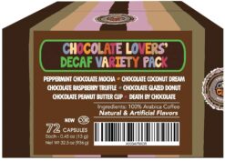 - YOUR FAVORITE CHOCOLATE DECAF COFFEES IN ONE BOX – Chocolate lovers variety pack includes: Death By Chocolate, Chocolate Glazed Donut, Peppermint Chocolate Mocha, Chocolate Coconut Dream, Chocolate Raspberry Truffle and Chocolate Peanut Butter Cup.