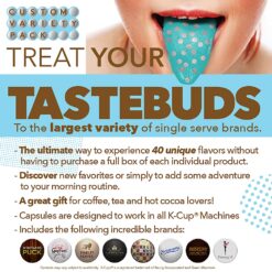 With this Custom Variety Pack Gourmet Flavor Coffee Assortment, we guarantee a delicious cup of coffee for every taste, preference, and mood.Each Crazy Cups mixed sampler box comes equipped with 30, individual coffee pods, boasting unique and tasty flavors that promise to tantalize the tastebuds and give you that extra boost you need in the morning, late afternoon at the office, or during after-dinner coffee and tea service.Featuring flavors like Caramel Vanilla Creme, Pumpkin Spice Pie, French Vanilla, and Hazelnut (along with popular brands like Double Donut, Cake Boss, and Martinsons) this collection of premium, single-serve coffee is sure to be a hit at work, at a party, or during the holidays like Thanksgiving and Christmas.Our coffee pod combo pack comes with Medium, Dark, and Bold blends to appeal to virtually everyone. The capsules are designed to accommodate all K Cup brewers, coffee makers, and machine models including K-Cup Keurig 2.0This coffee variety assortment is perfect for in-home use during breakfast, for commercial use at hotels, lobbies, restaurants, and offices, or as a gift set for a graduation, birthday, promotion, Mother’s Day, or housewarming.*Please note that each box is subject to change based on availability, so each package may vary in brands and flavors. K Cup, Green Mountain, and Keurig are registered trademarks and Crazy Cups has no affiliation with them.