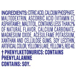 INGREDIENTS: CITRIC ACID, CALCIUM PHOSPHATE, MALTODEXTRIN,ASCORBIC ACID (VITAMIN C), ASPARTAME*, MALTITOL, CONTAINS LESSTHAN 2% OF NATURAL FLAVOR, CALCIUM CARBONATE, MAGNESIUM OXIDE,ACESULFAME POTASSIUM, XANTHAN AND CELLULOSE GUMS, SOY LECITHIN,ARTIFICIAL COLOR, YELLOW 5 LAKE, YELLOW 5, RED 40.*PHENYLKETONURICS: CONTAINS PHENYLALANINE