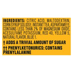 Ingredients: CITRIC ACID, MALTODEXTRIN, CORN SYRUP SOLIDS+, INSTANT TEA, ASPARTAME*, CONTAINS LESS THAN 2% OF MAGNESIUM OXIDE, ACESULFAME POTASSIUM, RED 40, YELLOW 5, NATURAL FLAVOR, BLUE 1*PHENYLKETONURICS: CONTAINS PHENYLALANINE<span>+ADDS A TRIVIAL AMOUNT OF SUGAR</span>