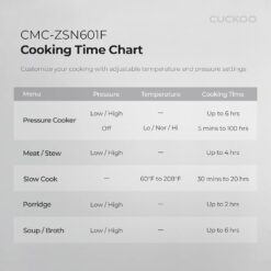 As an industry leader and a trusted Korean brand, CUCKOO strives to consistently deliver premium quality kitchenware and home products to households around the globe. Our 6QT. 8-in-1 Electric Pressure Cooker (CMC-ZSN601F) is equipped with functions that can steam, pressure cook, stew, slow cook, boil, or sauté an array of different dishes. Pastas, soups, yogurt, steamed vegetables, Spanish rice, tender meats and more will all be able to be effortlessly prepared in this cooker—making it the most space and cost-efficient option for every type of home cook! With its delay timer function, you can put ingredients in the inner pot up to 15 hours in advance, set the timer, then come home to a perfectly cooked meal at optimal serving temperatures. With our revolutionary combo feature, you can combine any two functions on the panel for simple automatic cooking. For example, the sauté function can be paired with the rice/multigrain function to make Spanish rice and risottos automatically! After the cooking is completed, the convenient auto-clean mode will automatically steam clean your unit for an easy and effortless cleanup. Featuring high-quality construction and premium accessories, such as the included stainless steel inner pot and user-friendly digital controls, you’ll be cooking with confidence in no time.