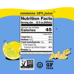 Carbonated Filtered Water, Organic Juice Blend from concentrate (White Grape, Ginger,Lemon), Natural Flavor, Citric Acid, Organic Coriander, Live Probiotic (Bacillus Subtilis), Organic Turmeric.