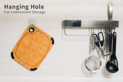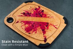 - Unique Design – The wood fiber cutting board is equipped with a juice groove on one side to prevent liquids from spilling onto the counter. Non-slip silicone corners/feet grip countertop surface, prevent the board from shifting during use, you can be confident the wooden chopping board will stay firmly in place, more spare time could be concentrated on the task at hand.