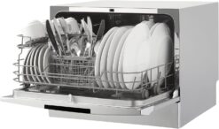 Washing has never been easier as it is with this stylish counter-top dishwasher. This unit utilizes just 3.1 gallons (11.7 liters) of water for a normal cycle. It comes with six different settings which can easily be programmed and monitored via the electronic LED display. The wash cycles range from soak, glass, rapid, economy, normal, and intensive. The dishwasher is designed for simple and quick installation as it can easily be hooked up to any tap in your kitchen. Keeping the appliance clean is a breeze due to its durable stainless-steel interior. There is an auto detergent and rinse agent dispenser for your convenience and this chic dishwashing unit is designed to fit under just about any type of kitchen cabinet. It also comes with a 12-month warranty on parts and labor.