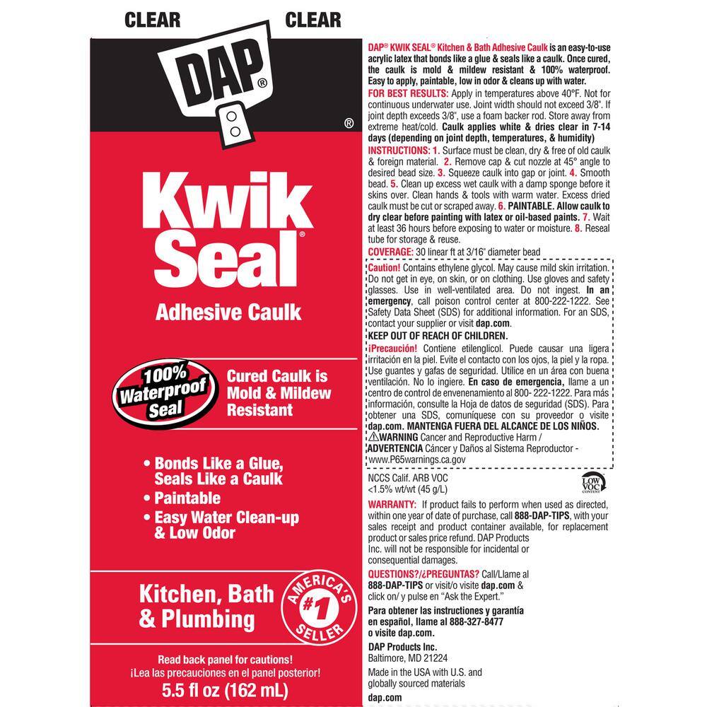 DAP Kwik Seal Kitchen & Bath Adhesive Caulk is an easy-to-use acrylic latex that bonds like a glue and seals like a caulk. Use Kwik Seal Clear Caulk to seal out water and moisture around tubs, showers, faucets, sinks, vanities, counter tops and fixtures. Kwik Seal Clear Caulk applies white and dries clear in 7 to 14 days depending on joint depth, temperature and humidity. Once cured, DAP caulk is 100% waterproof. Kitchen and Bath caulk is easy to apply and paintable 7 to 14 days following application after product dries clear. It is low in odor and cleans up easily with water. DAP caulk and sealants provide durable performance for a variety of projects including bathroom caulk projects.