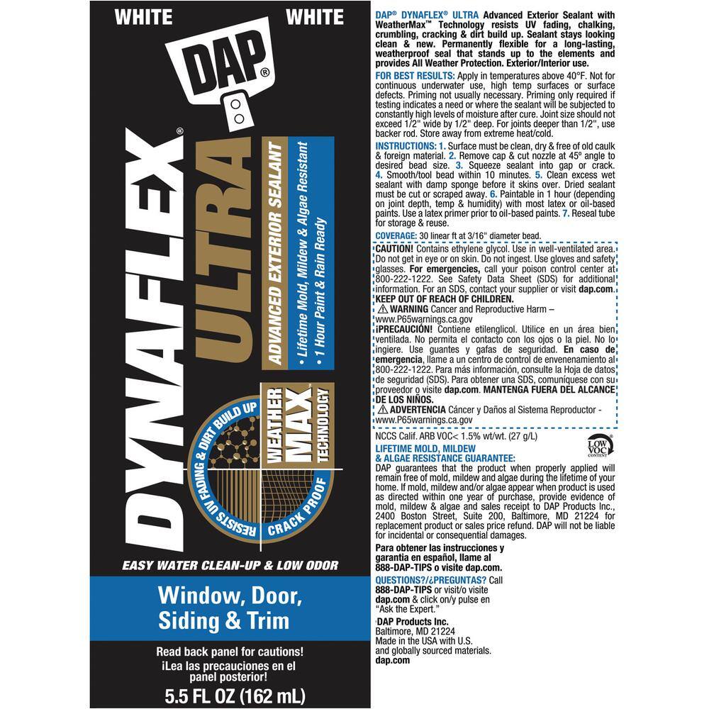 DAP Dynaflex Ultra Advanced Sealant for Window, Door, Siding & Trim applications is formulated with innovative Weather Max Technology to resist UV fading, chalking, crumbling, cracking and dirt build up. It also has a lifetime mold, mildew and algae resistance guarantee, so the sealant stays looking clean and new. Dynaflex Ultra has strong adhesion to common building materials and stays permanently flexible for a long-lasting, weatherproof seal that provides All Weather Protection and stands up to the elements. It is rain ready and paintable in one hour for better productivity. Waterproof sealant does not bubble, is low in odor and cleans up easily with water. DAP sealant guns out effortlessly and tools smoothly for easy application. Dynaflex Ultra meets ASTM C920, Class 35, is VOC compliant, and can be used on exterior applications. DAP caulk and sealants provide durable performance for a variety of projects.