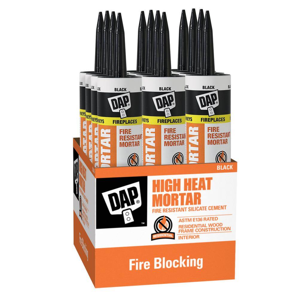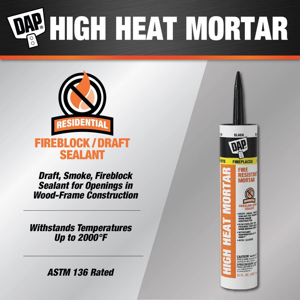 DAP High Heat Fire Resistant Mortar is a non-combustible silicate cement for applications in wood frame construction where an ASTM E136 non-combustible sealant is required, such as filling around vents, pipes, ducts and chimneys at ceiling and/or floor level prior to the application of drywall products. It was tested in accordance with ASTM E136 and withstands temperatures up to 2000 degrees Fahrenheit. It can also be used to patch chipped or cracked firebrick in fireplaces or wood-burning stoves. Adheres firmly to firebrick when wet or dry and sets rock hard when fired. Easy water clean-up. Works for interior uses.