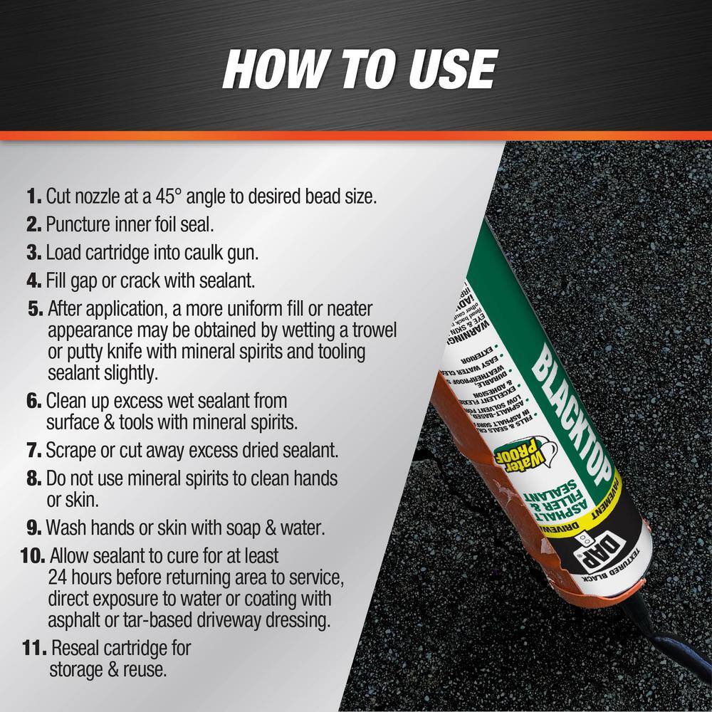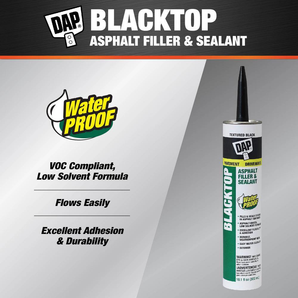DAP Blacktop Asphalt VOC Compliant Filler & Sealant is a high-quality, professional-grade asphalt-based compound that is ready to use with no heating or mixing required. Use to make fast and easy repairs. Blacktop filler is designed to fill and seal cracks in asphalt surfaces. Formulated to flow smoothly into gaps and create a durable barrier that prevents water infiltration helping avoid ice damage and surface deterioration. It provides a robust, waterproof, and weatherproof seal that offers exceptional adhesion. Resists crumbling and drying out due to temperature fluctuations, UV exposure, and other harsh weather conditions. DAP sealant will not run or bubble in hot weather, and will not crack or become brittle in cold conditions. Drying into a matte black finish, it can be further coated with asphalt or tar-based driveway treatments. Holds up to the elements by resisting oil grease, and salt. Exterior use. DAP caulk and sealants provide durable performance for a variety of projects.