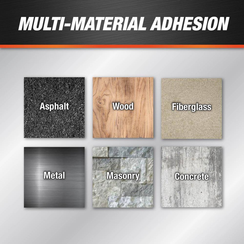 - Adheres to a wide range of building materials outdoors including asphalt surfaces, concrete, wood, fiberglass, and more
