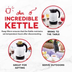 - Kettle maintains internal heat, making it perfect for travel or preparing drinks ahead of time, and lifts easily off the base for serving