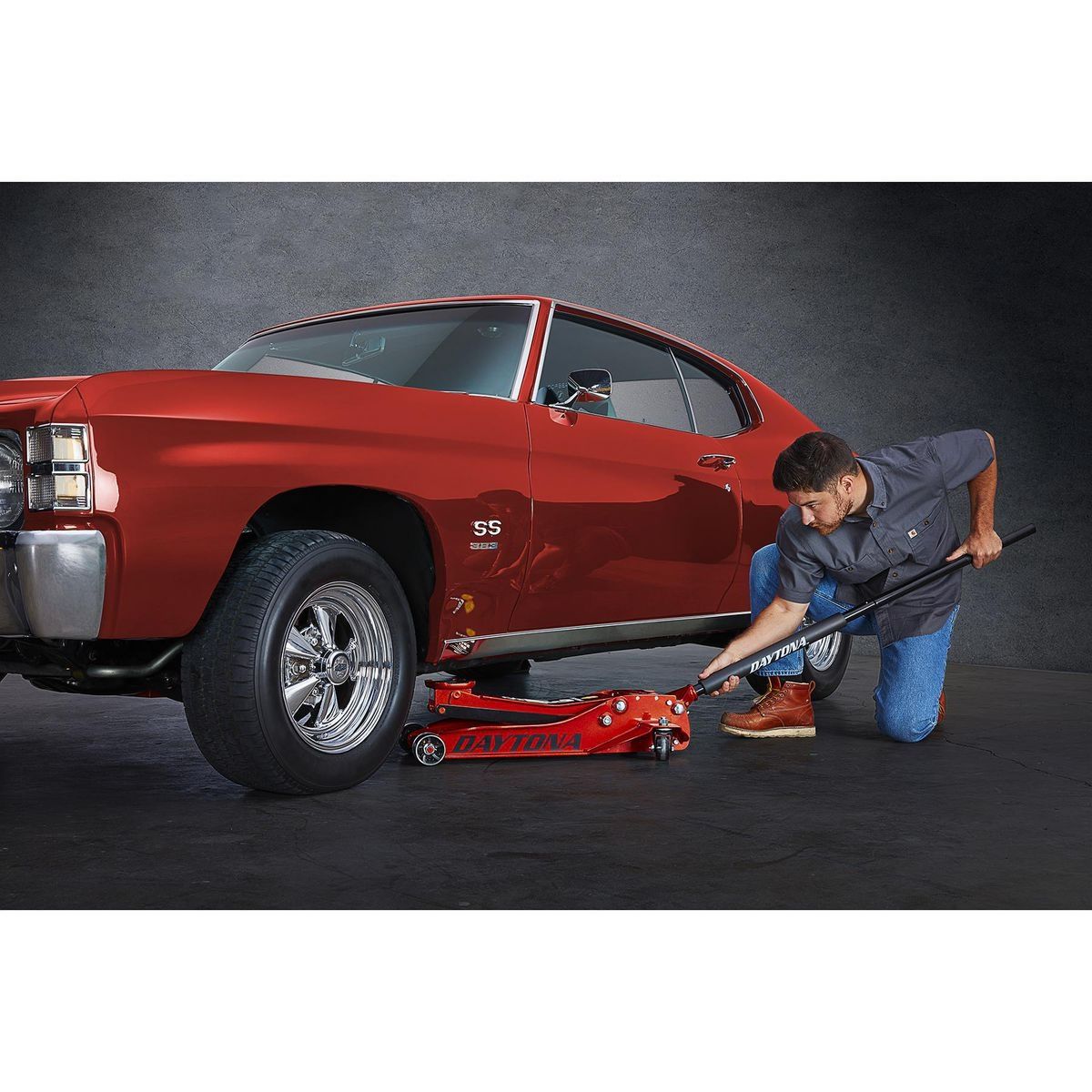 This DAYTONA™ 3 Ton Low-Profile Superduty Floor Jack works as hard as you do. Premium quality piston seals plus an internal magnetic filtration system work together to extend pump life. RAPID PUMP® dual parallel-pump technology lifts in far fewer strokes. The universal joint release provides precise load control for smooth descent.