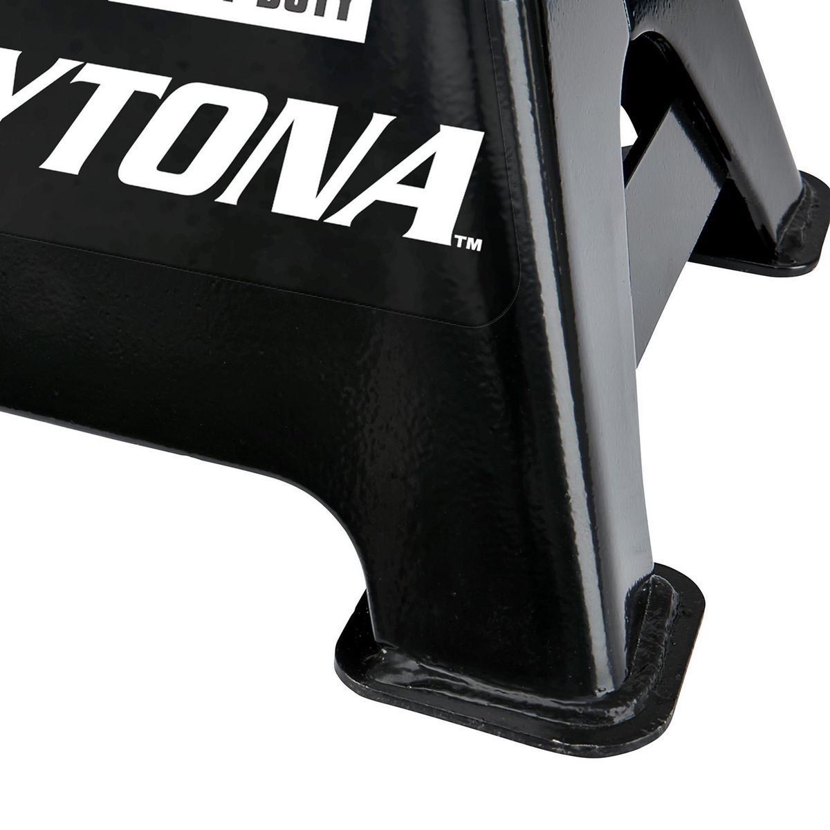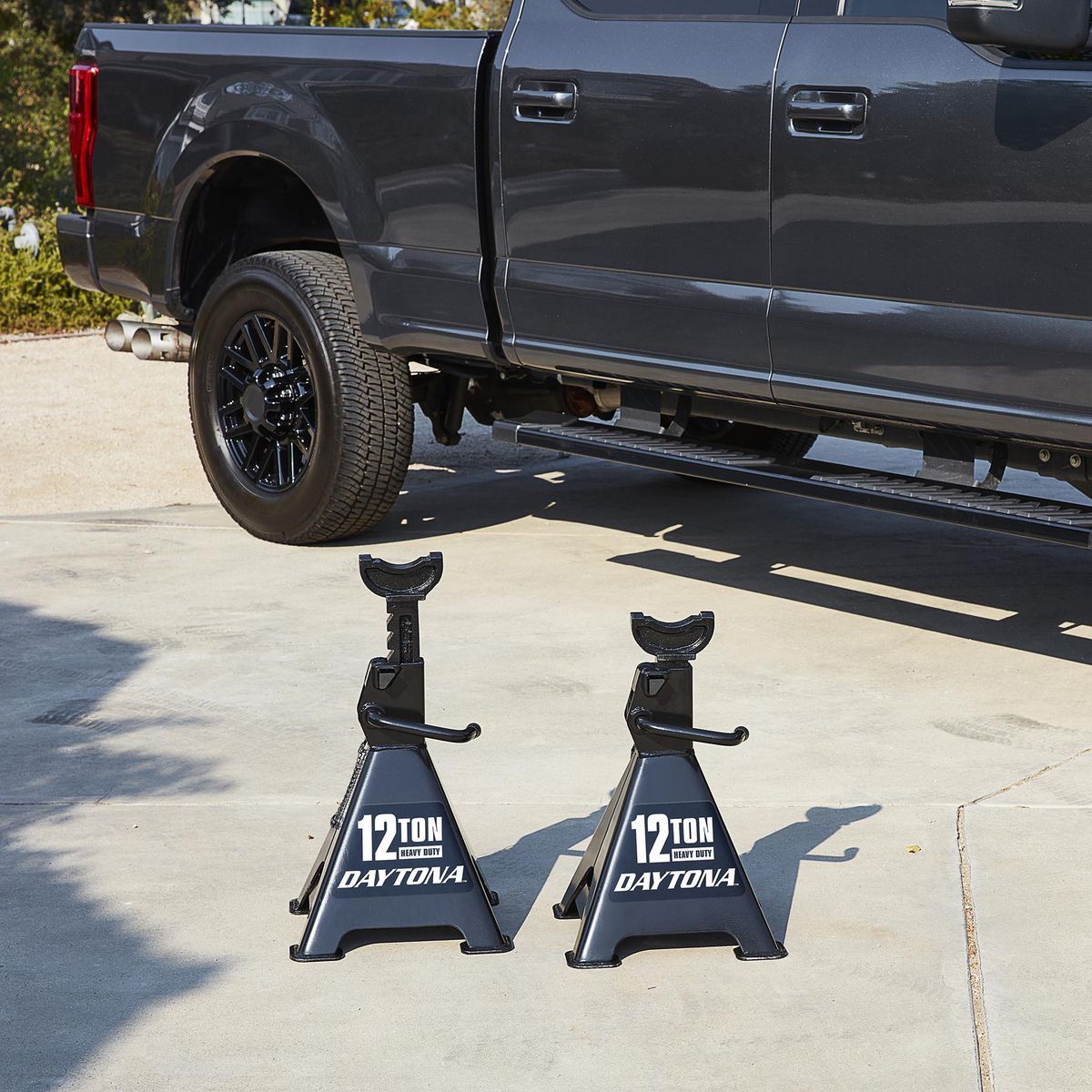 The DAYTONA™ Heavy Duty Jack Stands safely support up to 24,000 lb., offering stable, dependable protection. They are constructed with heavy duty, solid steel body panels and welded-in reinforcement braces for added strength and durability. These jack stands feature an easy-to-use ratcheting system to make quick height adjustments and double-locking mobility pins for extra safety and security.