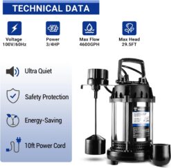 - 【HIGH-CAPACITY PUMPING】The 3/4HP high power basement sump pump moves up to 4600 gallons per hour and will lift water up to 29.5′ of vertical height,perfect for keeping you basement dry during heavy water flow.