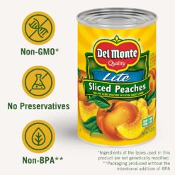 DEL MONTE Yellow Cling Canned Peaches in Extra Light Syrup make it easy to enjoy high quality fruit in minutes. These sliced peaches are packed with delicious, ripe peaches in extra light syrup for a ready to eat fruit snack you can feel good about. DEL MONTE lite peaches contain no artificial preservatives making them a convenient, wholesome and ready to eat fruit option for busy nights. Picked and packed at the peak of freshness and immersed in extra light syrup, this Non-GMO* canned fruit is ideal as part of a quick lunch snack or as a flavorful peach pie filling or addition to fruit salad. For more delicious options, try using the canned peach slices to make peach jam. Each Non-BPA** can stores well in a pantry or cabinet for a convenient fruit snack whenever you need delicious fruit on-the-go. Bring the wholesome goodness of the Earth to your family with DEL MONTE Peaches. *Ingredients of the types used in this product are not genetically modified. **Packaging produced without the intentional addition of BPA.