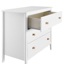 The Casey 3 Drawer Dresser by Delta Children will instantly elevate your nursery with its mid-century modern style. Clean lines, playful round knobs, and tapered legs define this beautiful dresser. This dresser also has a smooth metal glide system with safety stops that prevent drawers from pulling out, so it is easy and safe for kids to manage on their own. Pair this dresser with other pieces in the Casey Collection for a coordinated look, as well as the coordinating Changing Top #W100810 (sold separately) to transform this dresser into a convenient changing table