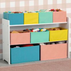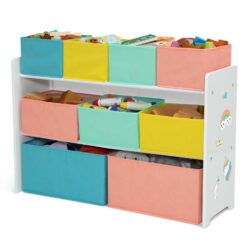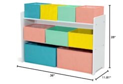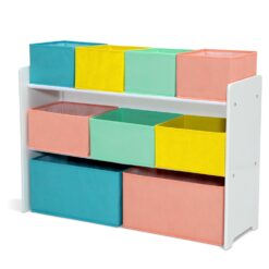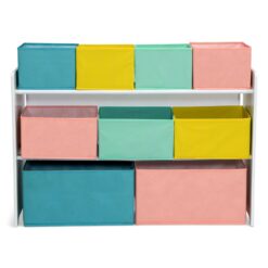 Easily organize your child’s toys with the Deluxe Multi-Bin Toy Organizer with Storage Bins from Delta Children. Featuring nine (9) toy bins in varying sizes and bold colors, it offers a stylish storage space for toys of all shapes and sizes. Designed to be the perfect kid-sized height, it allows your child to clearly view and select their favorite toys—and makes it easy for them to clean up when they’re done playing. Constructed of strong and sturdy wood, the Deluxe Multi-Bin Toy Organizer with Storage Bins is a lasting piece that will encourage years of imaginative play.