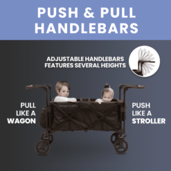 - PULL/PUSH HANDLES: Push/pull handlebars feature several height positions | Stroller certified and thoroughly tested | Features cushioned seats with 3-point safety harnesses | Assembled size: 51.2″L x 19.5″D x 44″H | Folded size: 16.”L x 12.6″D x 31.5″H | Weighs 36.3 lbs.