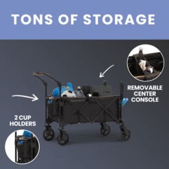 - TONS OF STORAGE: Removable center console with 2 cup holders and storage pocket allows kids to share snacks, toys and drinks | Outside pockets and parent cup holder provide extra storage | Compact fold for easy transport/storage