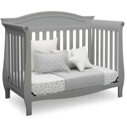 Welcome Baby home with the Lancaster 4-in-1 Convertible Baby Crib from Delta Children-rolled arms with a decorative rosette accent and sleigh-style silhouette make this classic crib a timeless choice. Designed to grow with your little one, this baby crib features three mattress heights that allow you to lower the crib mattress as your child begins standing.