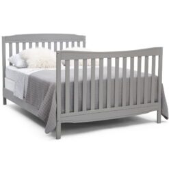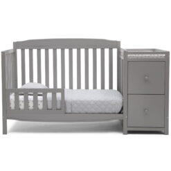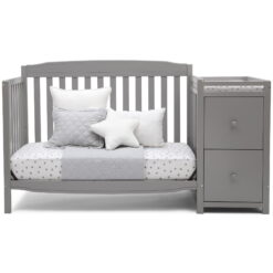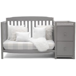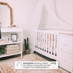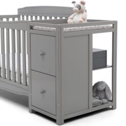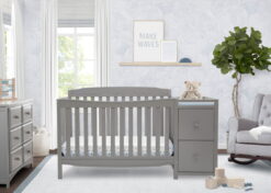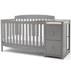 The Mason Convertible 6-in-1 Baby Crib and Changer by Delta Children combines style and storage for the perfect space-saving crib and changing table combo. A versatile option for those who need multi-functional nursery furniture, the Mason provides all the elements needed to create the ultimate nursery–without taking up a lot of floor space. Built to accommodate every stage, this crib features three mattress height positions that can be easily lowered as your baby begins to sit or stand. Plus, this crib converts into a toddler bed, daybed, sofa, full-size bed with headboard only, and full-size bed with headboard and footboard (Daybed/Sofa Rail included, Toddler Guardrail and Full-Size Bed Rails sold separately). The secure changing table section includes a changing pad on top, two drawers and an open cubby space to help keep your baby’s essentials close.