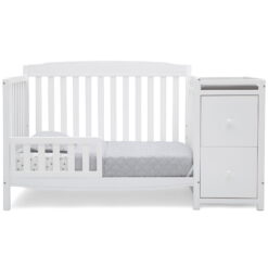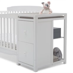 The Mason Convertible 6-in-1 crib and changer from Delta Children combines style and storage to create the perfect space-saving baby crib and changing table combo. A versatile option for those who need multi-functional nursery furniture, the Mason provides all the elements needed to create the ultimate nursery without taking up a lot of floor space. Built to accommodate every stage of your child’s life, this crib features three mattress height positions that can be easily lowered as your baby begins to sit or stand. Plus, this crib converts into a toddler bed, daybed, sofa, full-size bed with headboard only, and full-size bed with headboard and footboard. The secure changing table section includes a changing pad on top, then underneath two drawers and an open cubby space to help keep your baby essentials close at hand. Everything you need to furnish your nursery.