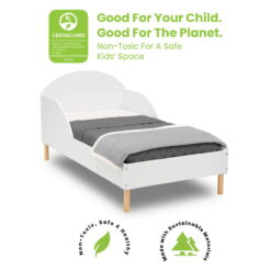The Reese Wood Toddler Bed by Delta Children is a must-have bed for stylish parents and kids! Designed to elevate big-kid bedrooms, it features a rounded headboard and includes two sets of legs–choose from natural-colored legs or pink colored legs. More than just a good-looking option, this toddler bed is extremely safe with its two attached guardrails and a low height that makes it easy for kids to get in and out on their own. Plus, it’s GREENGUARD Gold certified, which means it passes the most stringent emission standards. It contributes to cleaner indoor air, creating a healthier space for you and your child. Coordinates with other items in the Reese Collection. Mattresses not included.
