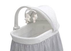 Delta Children Smooth Glide Bedside Bassinet – Portable Crib with Activity Mobile Arm Featuring Spinning Toys, Nightlight and Music, Silver Linings